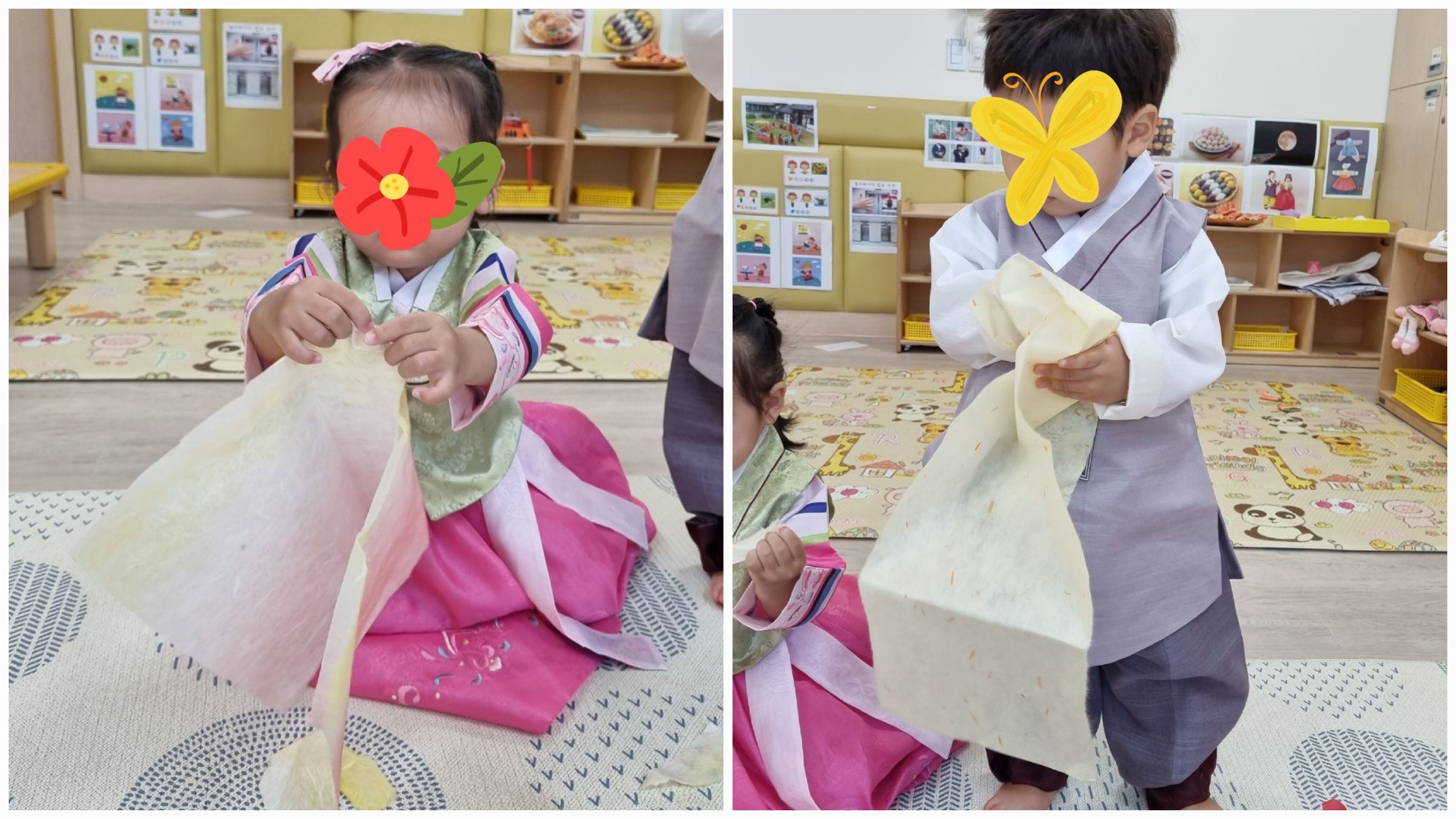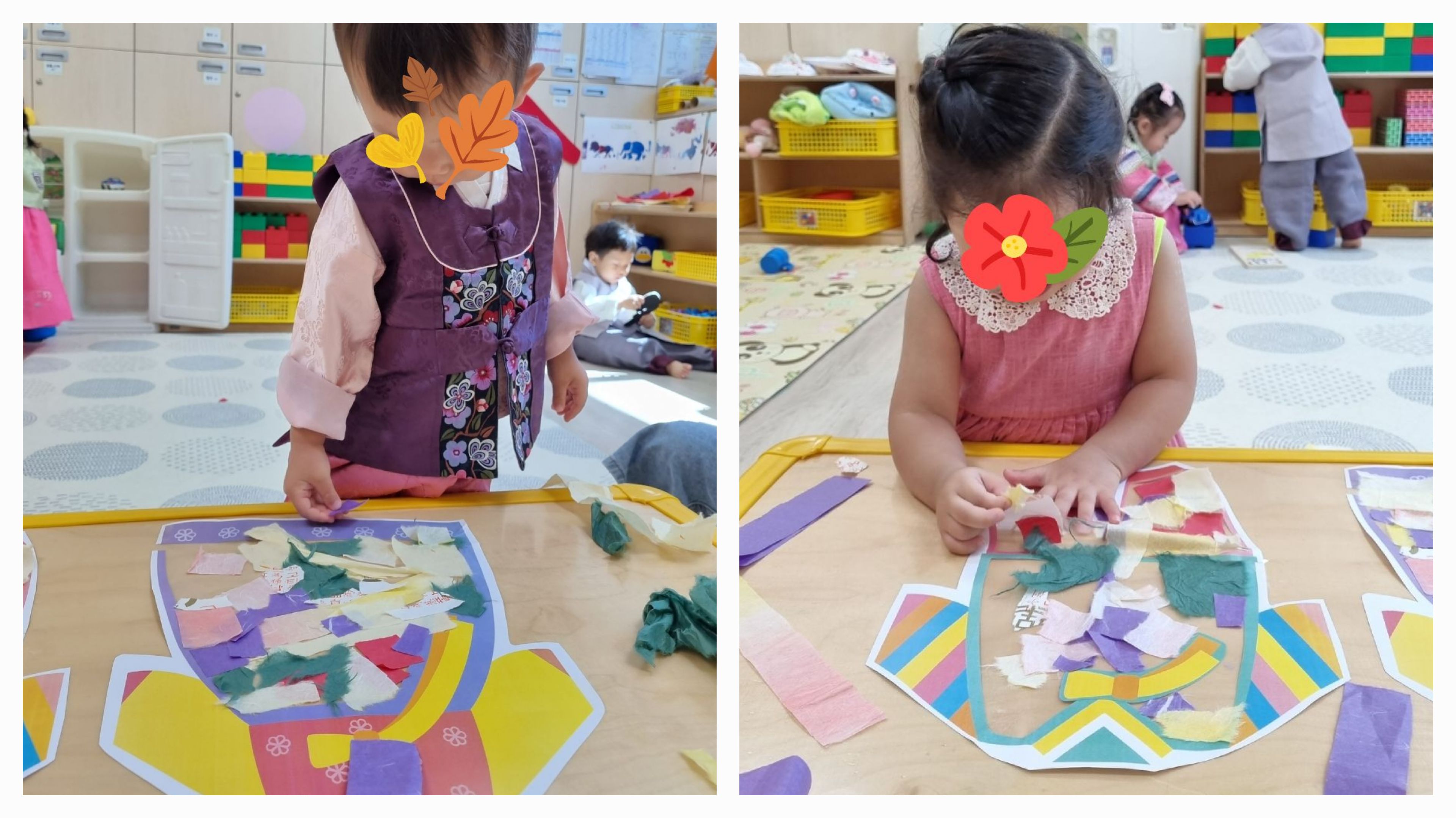 한복을 꾸미면서 미술활동도 경험해보고, 한지를 찢거나 오리며 소근육을 발달시킬 수 있는 놀이랍니다.