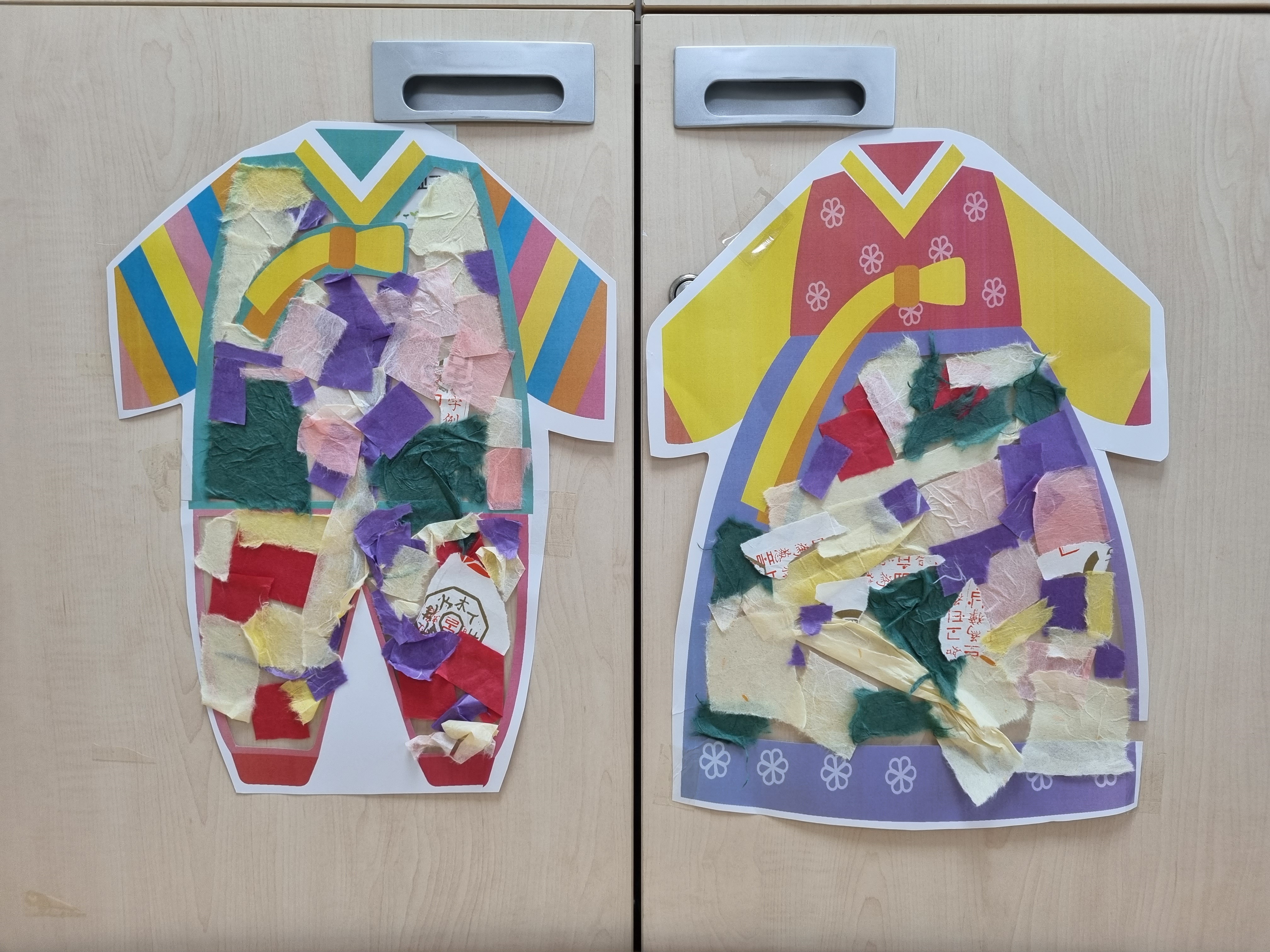 3. 투명 시트지의 끈적한 면에 찢은 한복을 붙여서 꾸며줍니다.