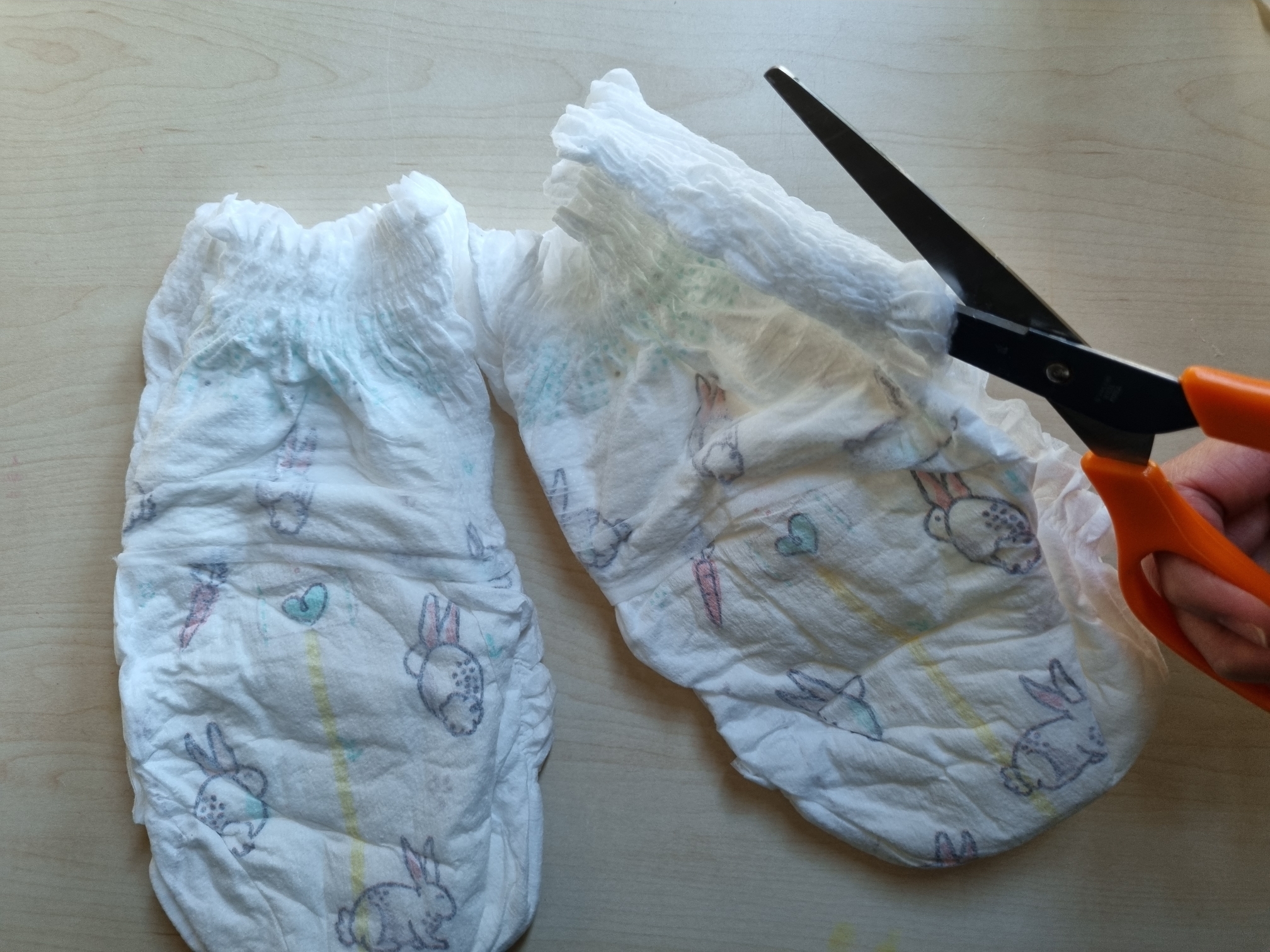 1. 기저귀의 양 옆 허리 부분을 잘라 길쭉하게 펼쳐줍니다.