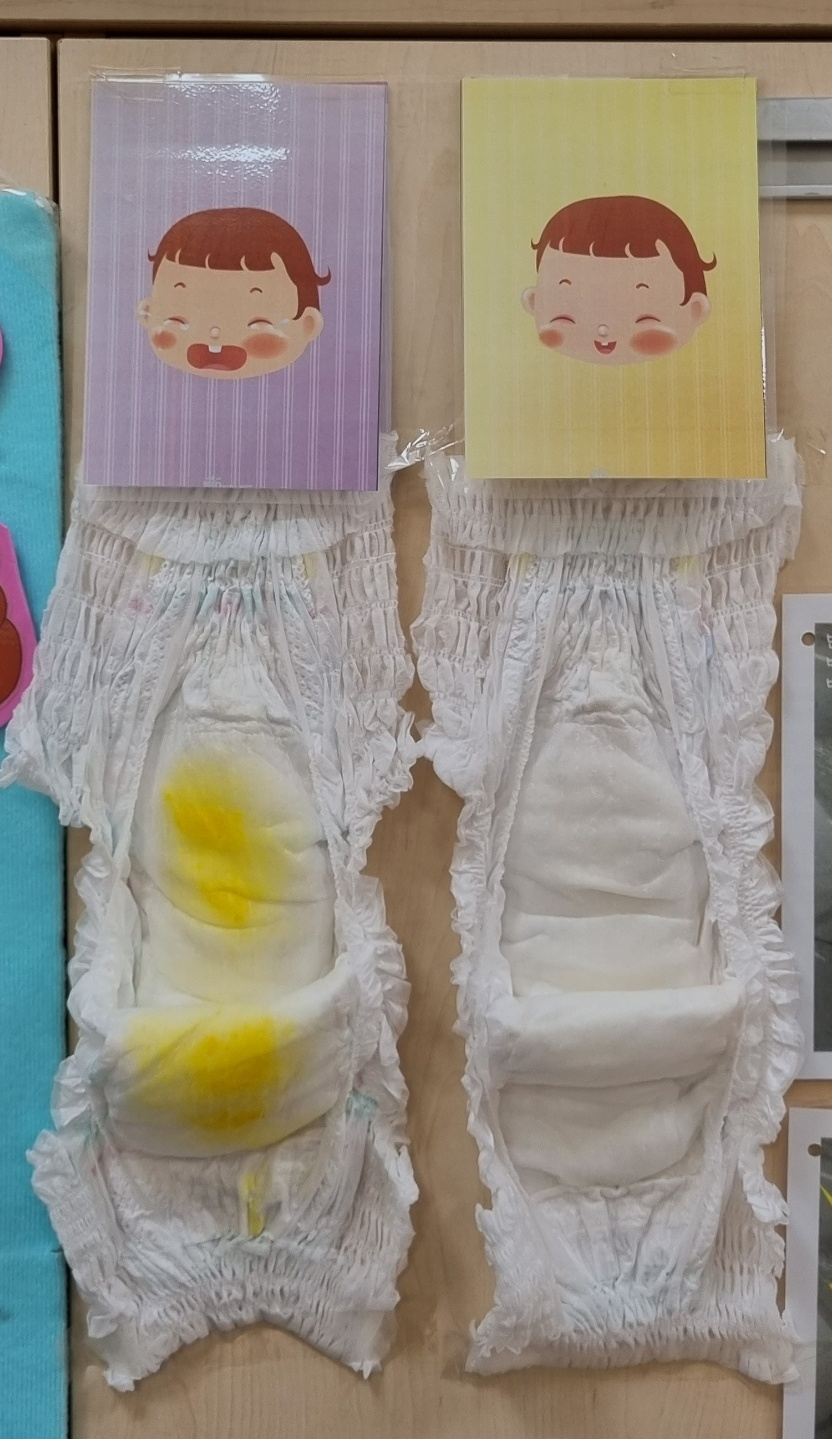 *준비물: 기저귀 2개, 물감, 불편한 표정과 기분좋은 표정 그림 각 1개