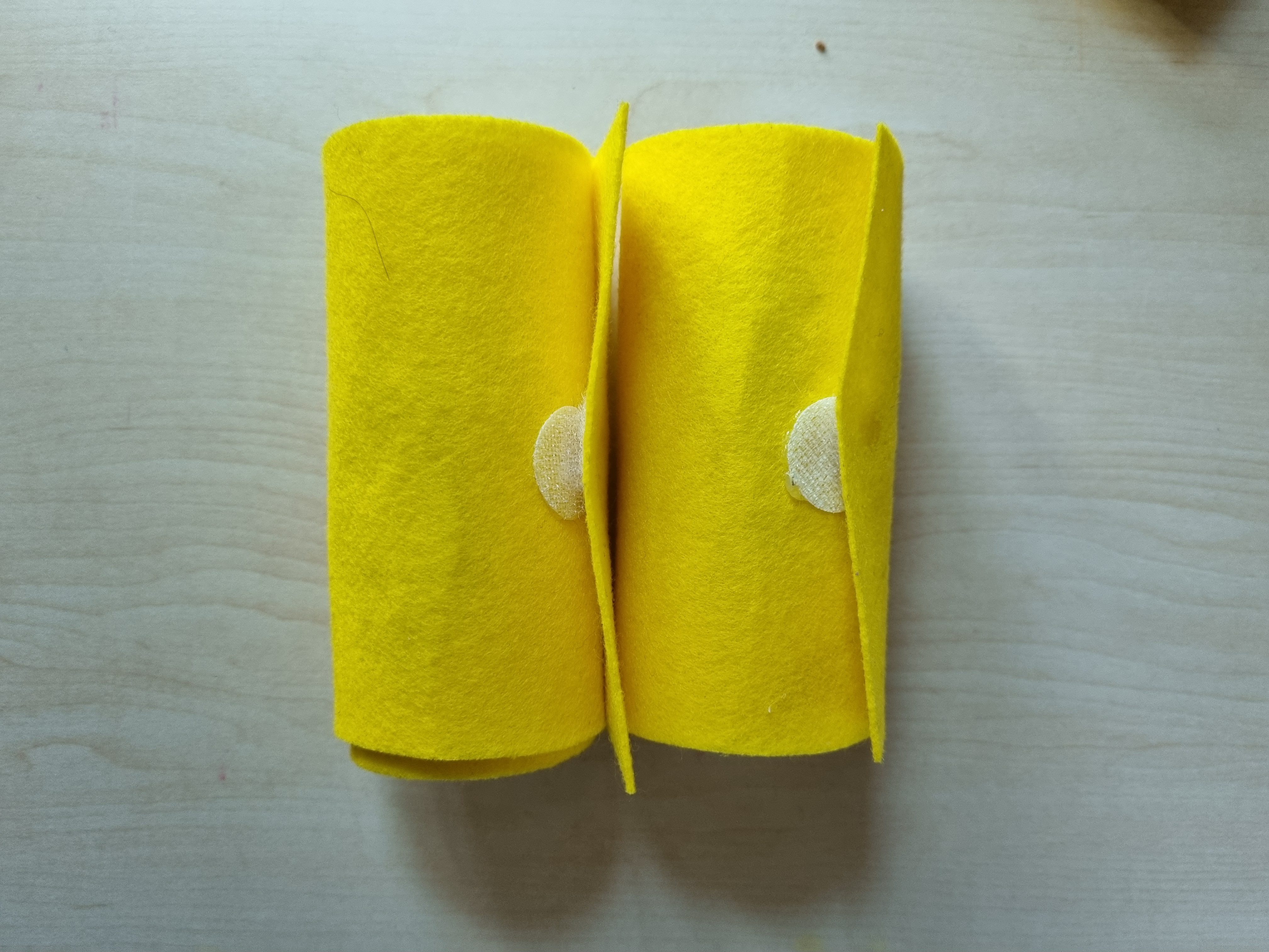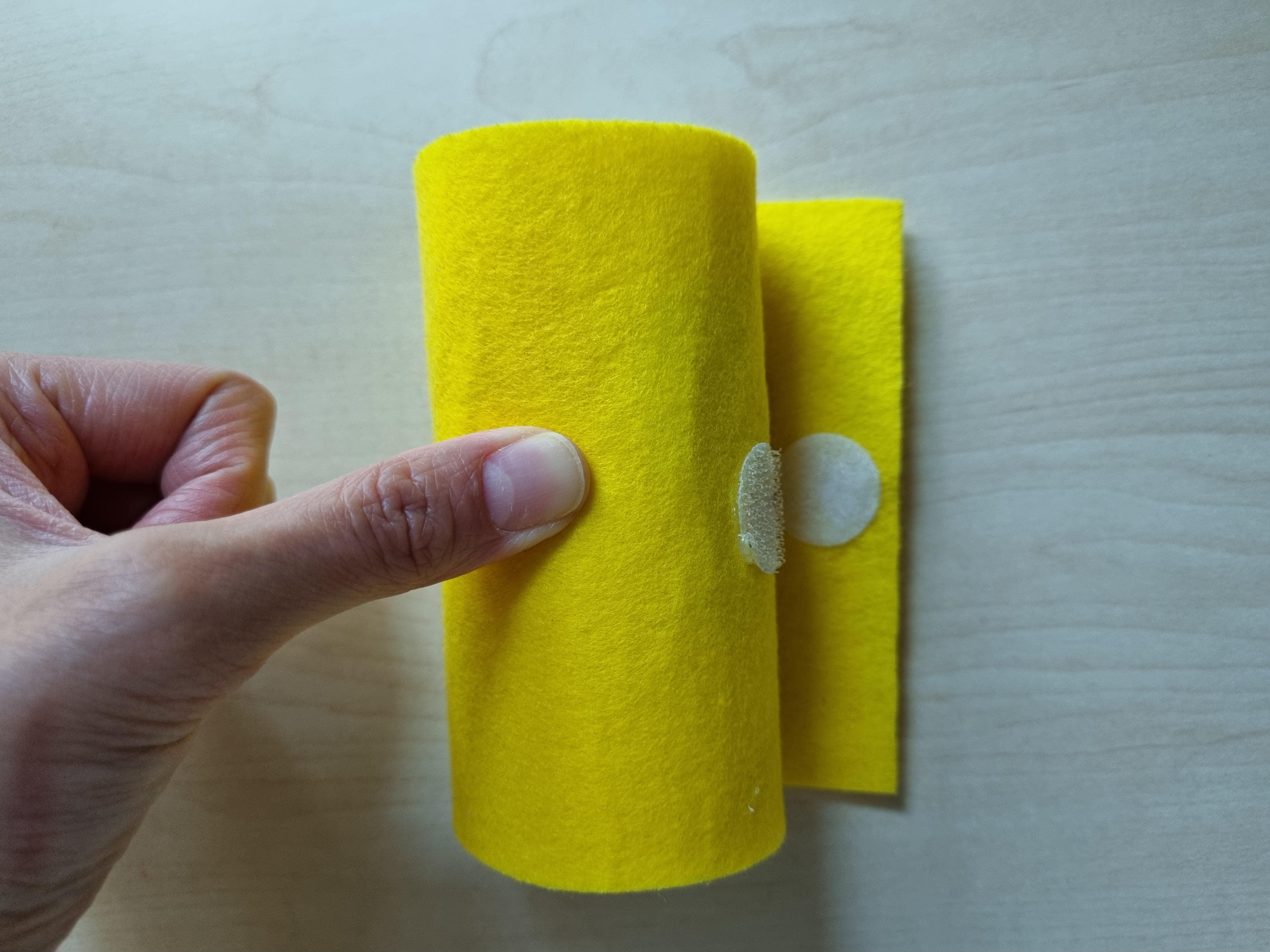 3. 펠트가 감긴 휴지심을 돌돌 말아봅니다. 펠트가 끝나는 지점에 벨크로테이프를 하나 붙이고, 그 벨크로테이프가 맞닿는 지점에 하나 더 붙여주세요.