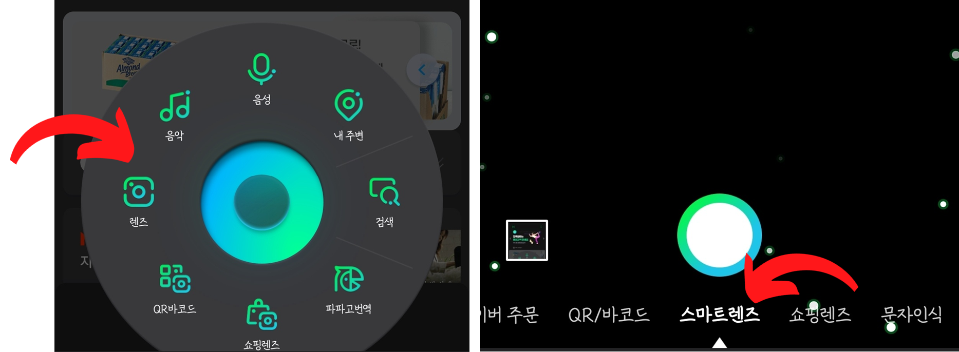 2. '렌즈'를 누릅니다. 그러면 오른쪽 그림과 같이 '스마트렌즈' 상태로 카메라가 실행되어요.