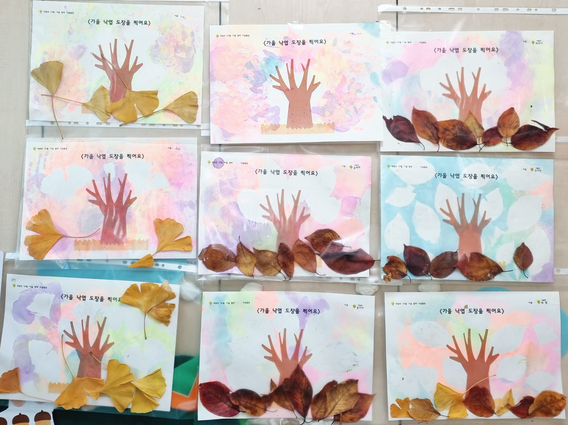 낙엽끼리 겹치지 않게 붙이면 결과물이 더 예쁘게 나와요.
