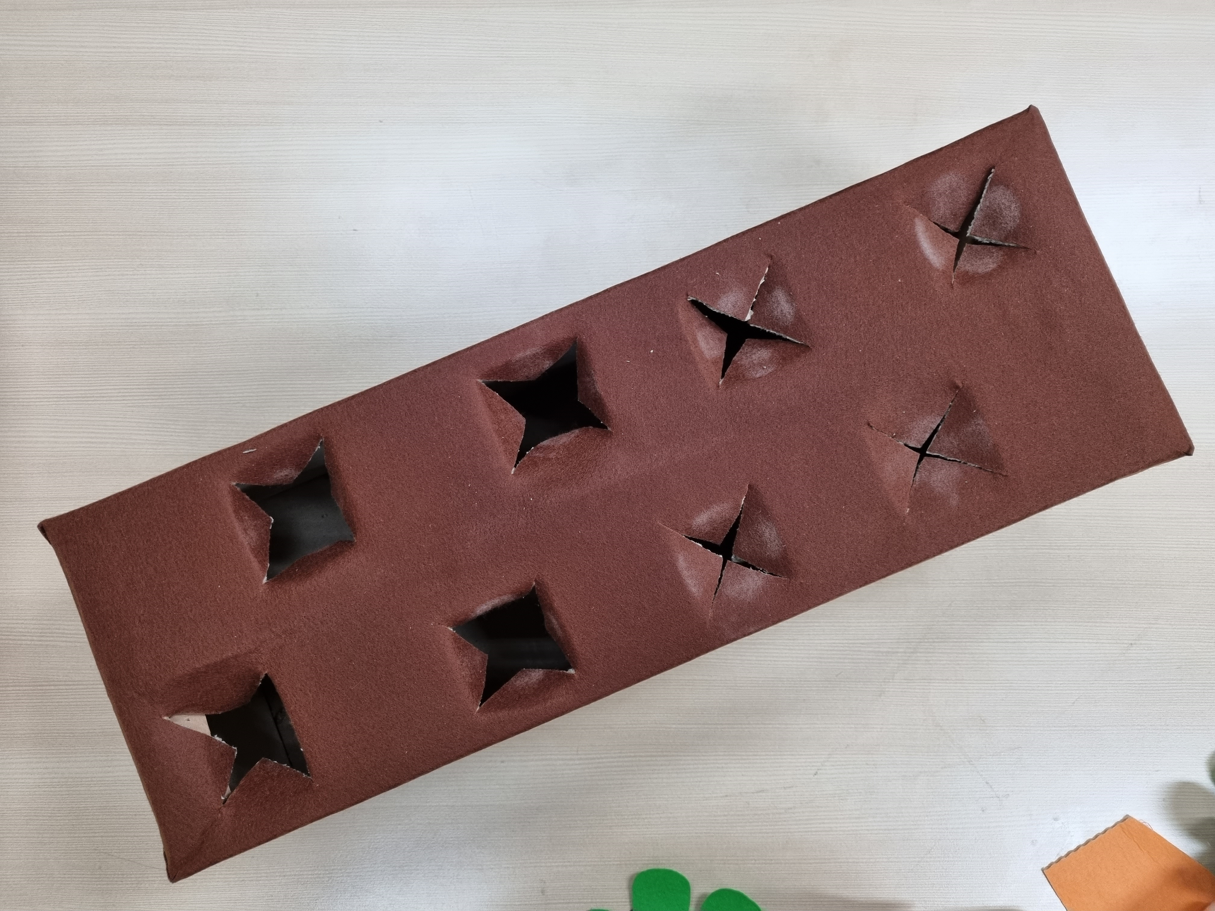 6. 무 밭을 만들거에요. 상자를 갈색 펠트로 감싸고 윗면에 무를 넣을 구멍을 뚫어줍니다.
